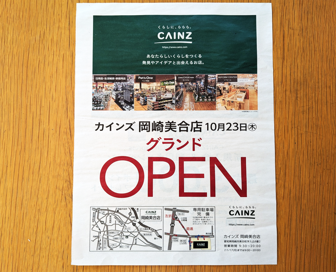 チラシやホームページなどで公開されている通り、岡崎市美合町に「カインズ岡崎美合店」が2025年10月23日(木)にオープン予定です。