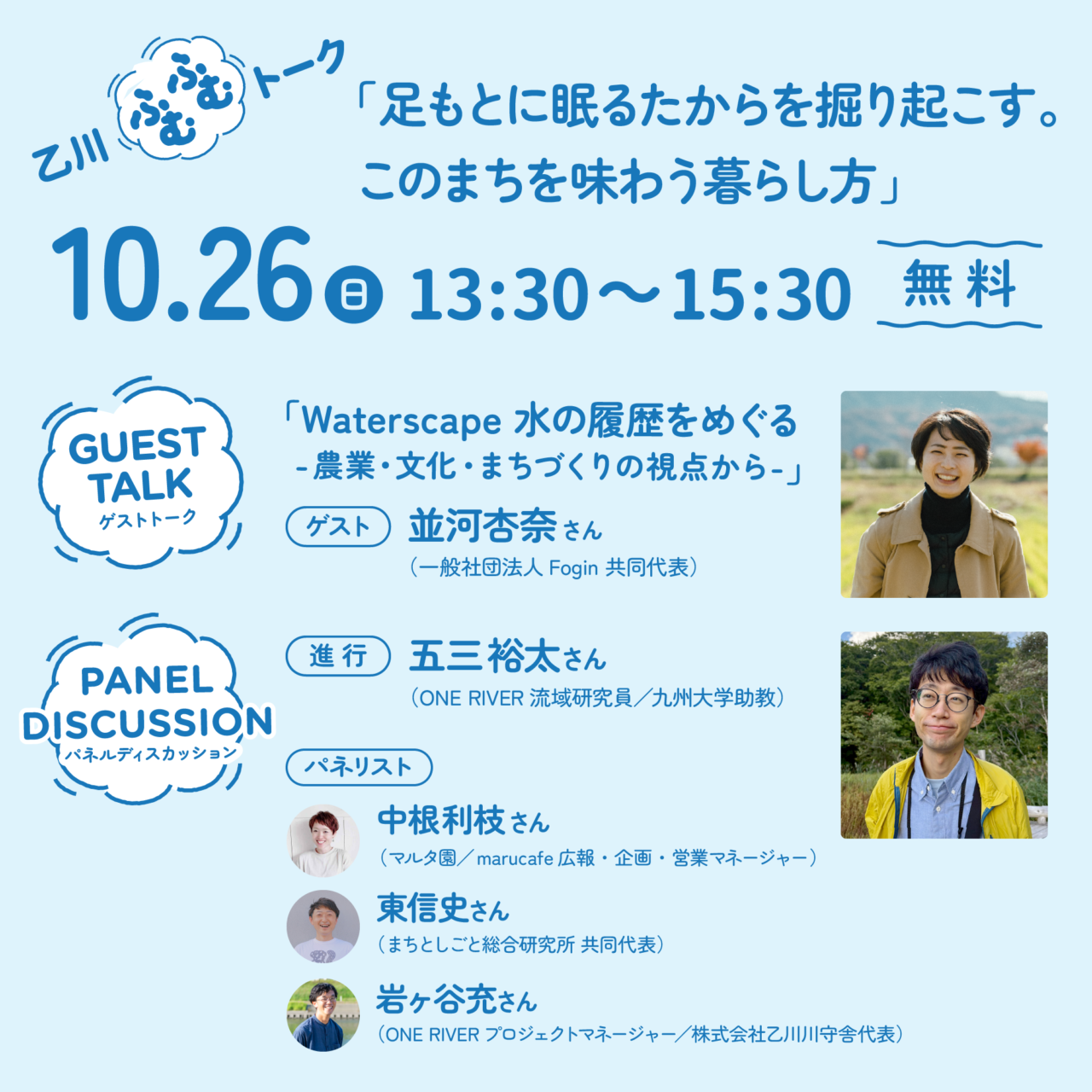 さらに、26日(日)13:30からは「乙川ふむふむトーク」として、川と農業、文化、まちづくりといった様々な視点から、豊かな暮らしの可能性について深く考えるトークイベントも開催されます。