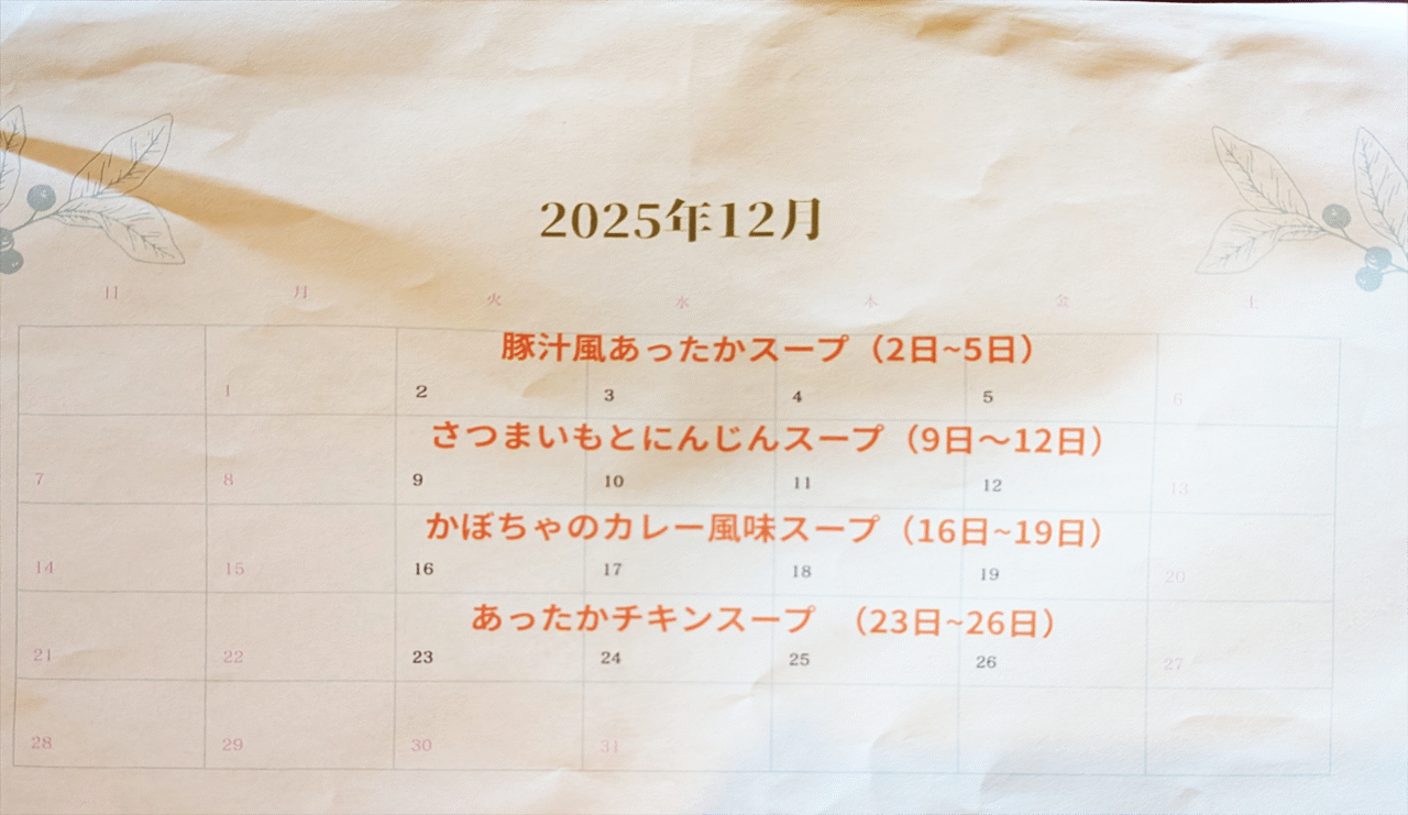 週替わりで提供されるスープは、近隣の方から善意でいただいた野菜なども活用しながら、丁寧に手作りされているとのこと。地域とのつながりを大切にしながら、食材を無駄にせず活かすという想いが込められています。