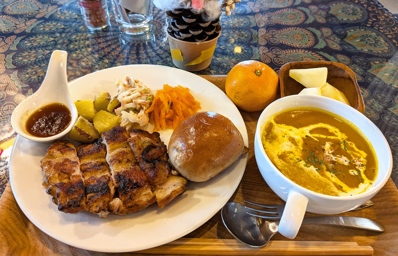 香ばしく焼かれたチキンは、そのまま食べても、醤油味のソースをかけていただいても、どちらも本当に美味しいのです。プレートには副菜が3種類添えられ、さらにフルーツとデザート、ドリンクまで付いており、栄養バランスも考えられた充実の内容。ボリュームもしっかりあり、お腹いっぱいになります。