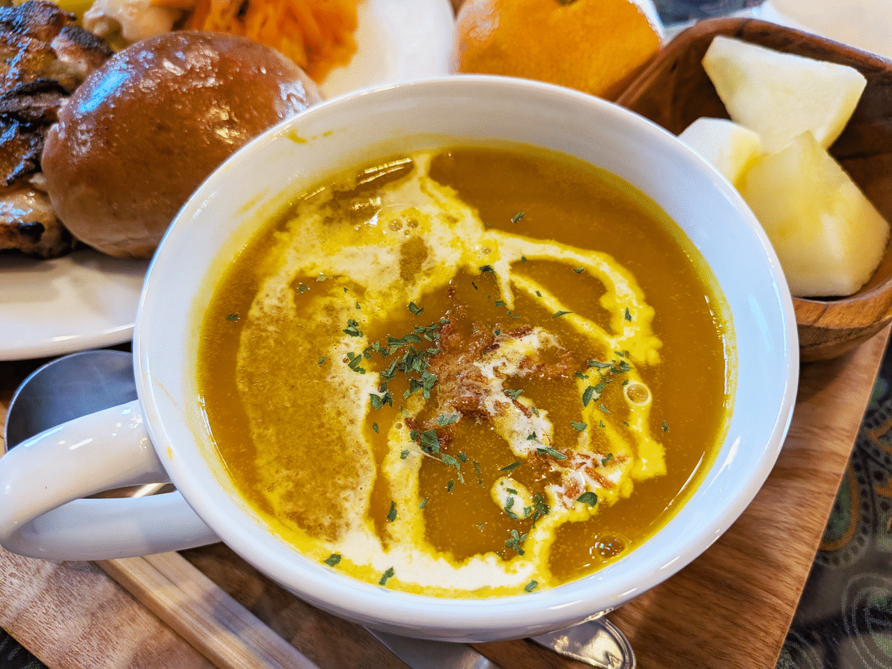 スープは、野菜の優しい甘みとスパイスの風味が絶妙にマッチし、一口飲むごとに体が内側から温まるようなやさしい味わいです。お店がスープを推している理由が、自然と伝わってくる一品。