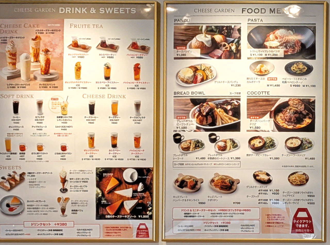 メニューを見ると、定番のチーズケーキやドリンクといったスイーツ類のほか、ランチ利用にも向いた食事メニューが充実しています。ブレッドボウルやパスタ、季節の野菜やパンを国産の白ワインの風味を生かしたチーズフォンデュソースで楽しめる「チーズパンデュ」、チーズハンバーグドリアなど、バラエティ豊かなラインナップがそろっています。