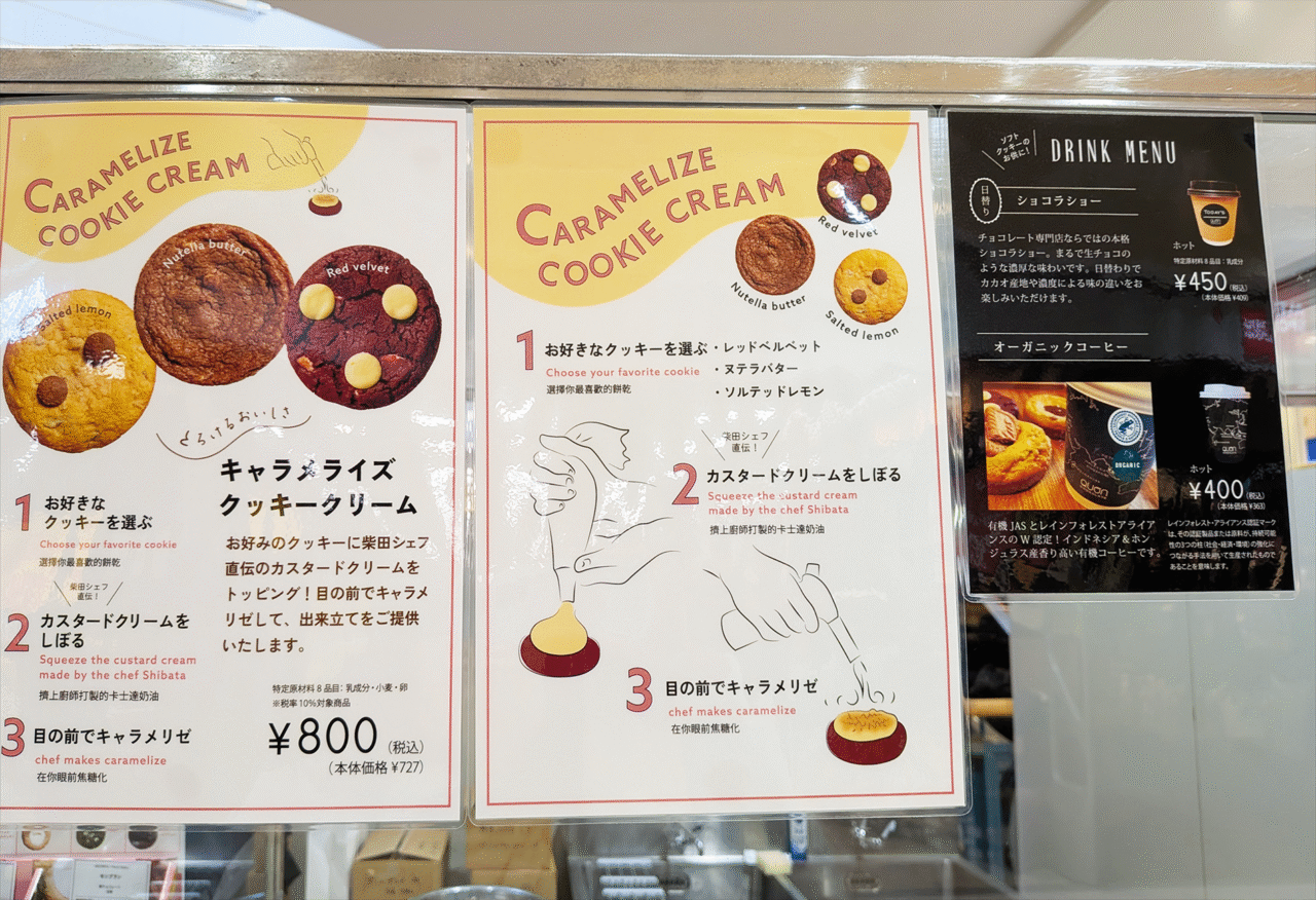 今年のQUONのブースで一番の注目は、その場で仕上げてくれる「キャラメライズ クッキークリーム(税込800円)」です。世界的なパティシエ・柴田シェフ(シェ・シバタ)が監修した特別なカスタードを使っており、ライブ感たっぷりの工程を楽しめます。