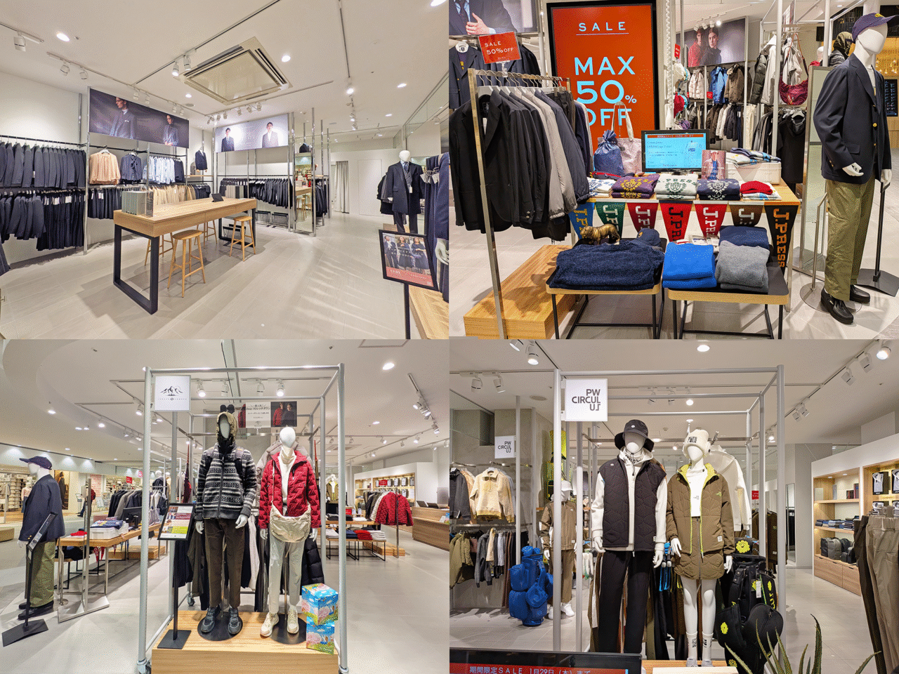 仕事用のスーツだけでなく、週末のゴルフやキャンプ、大切な日のカジュアルな装いまで、一度にチェックできるのがこの店舗ならではの魅力。お買い物ついでにふらっと立ち寄り、ライフスタイルに合わせたトータルコーディネートを楽しめます。