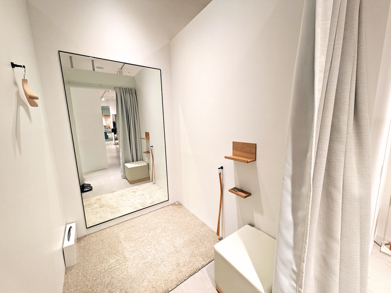 特筆すべきは、かなり広めに設計されたフィッティングルームです。 ベビーカーをお使いの方や、ご家族と一緒に確認したい方でも、窮屈さを感じることなく試着を楽しめます。