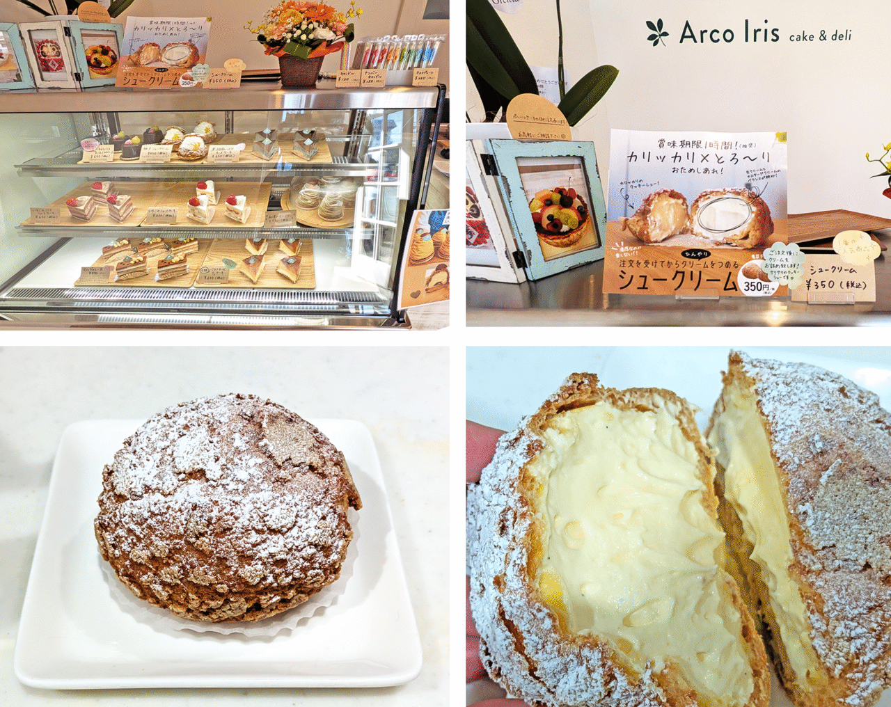 アルコイリスのスイーツは、定番ケーキから季節の素材を使った種類まで幅広く、どれも丁寧に仕上げられています。中でもシュークリーム(税込350円)は、注文後にクリームを詰めてもらえるスタイルで、外側のサクサク生地とクリームのなめらかさが魅力です。