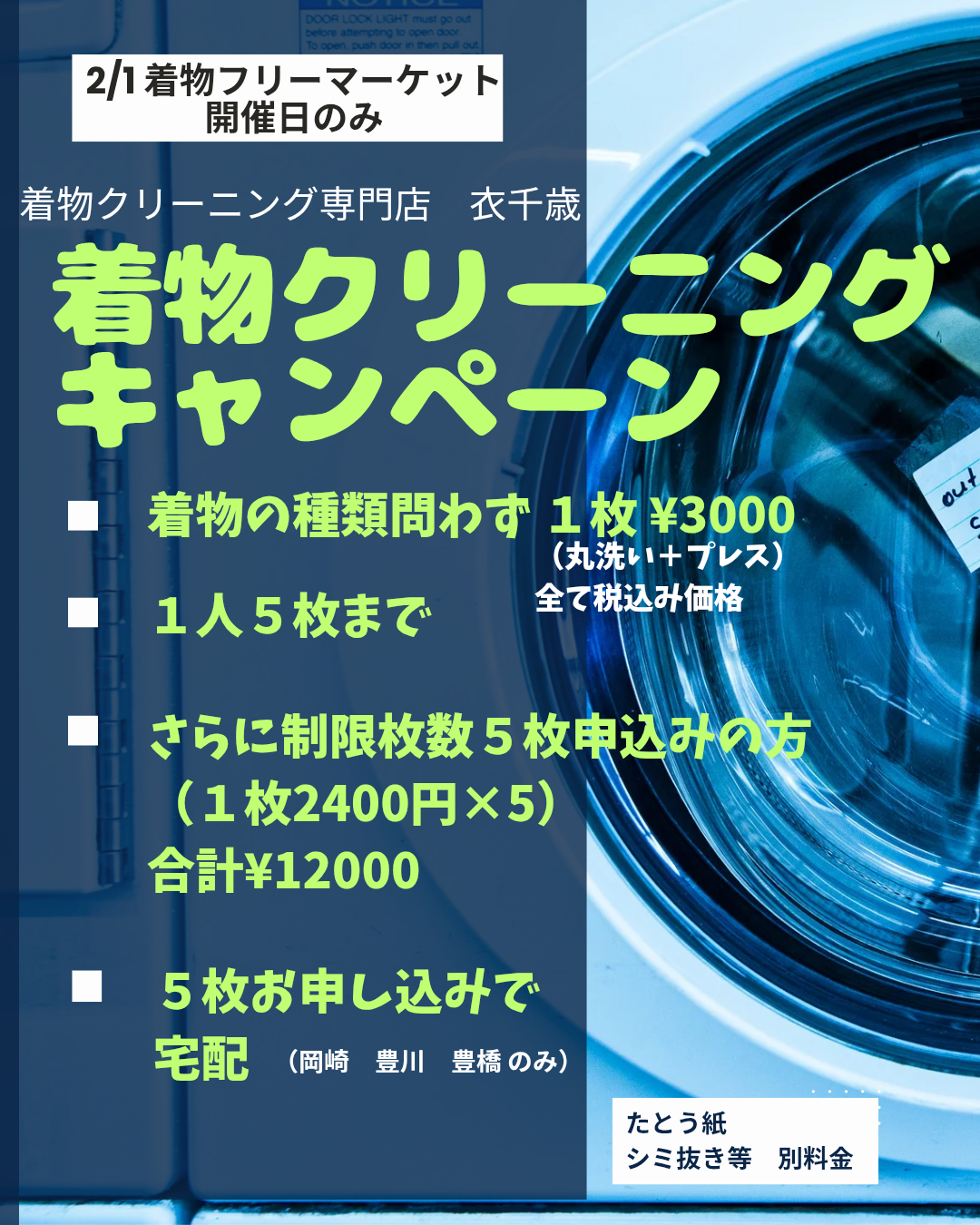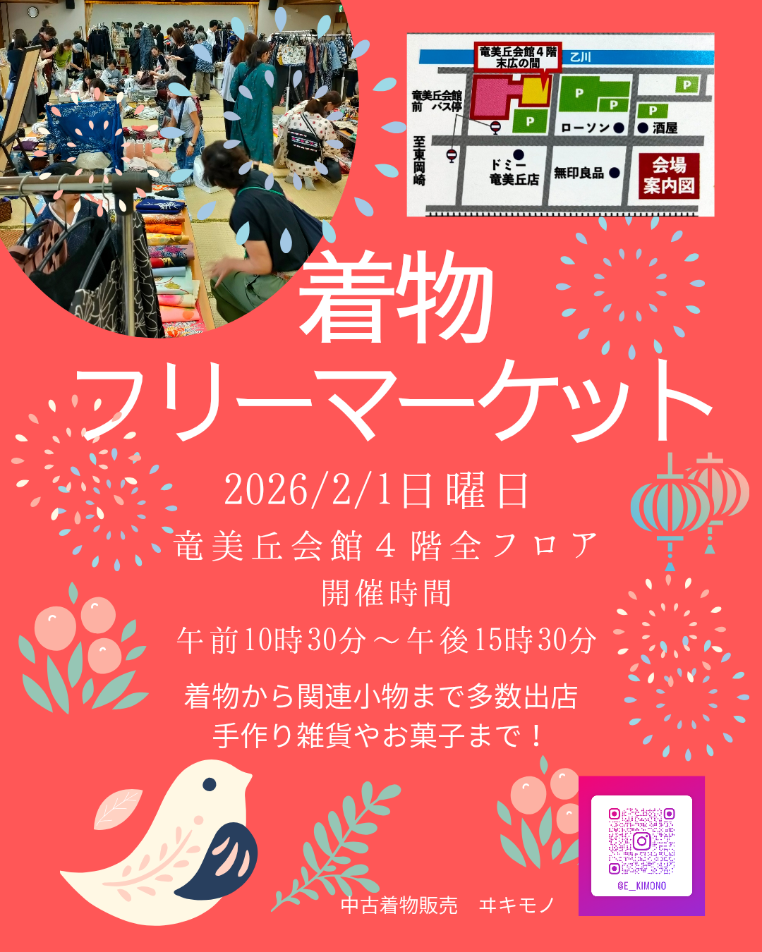 2026年2月1日(日)10:30~15:30、岡崎市竜美丘会館4階フロアで「着物フリーマーケット」が開催されます。会場には、まだまだ活用できる美しいお着物が豊富に並びます。
