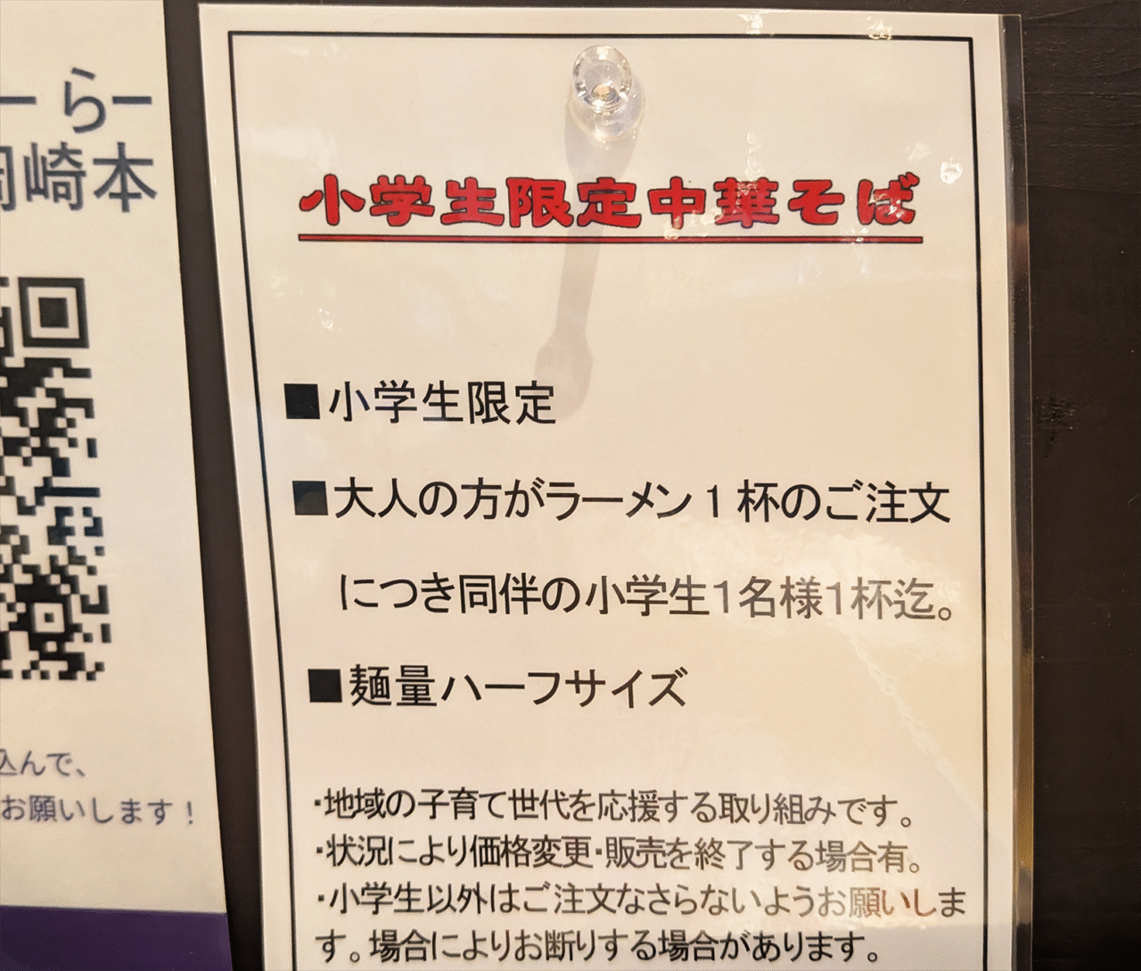 今回、特に「岡崎市の子育て世代を応援しているな」と感動したのが、小学生限定の「中華そば」に関するサービスです。