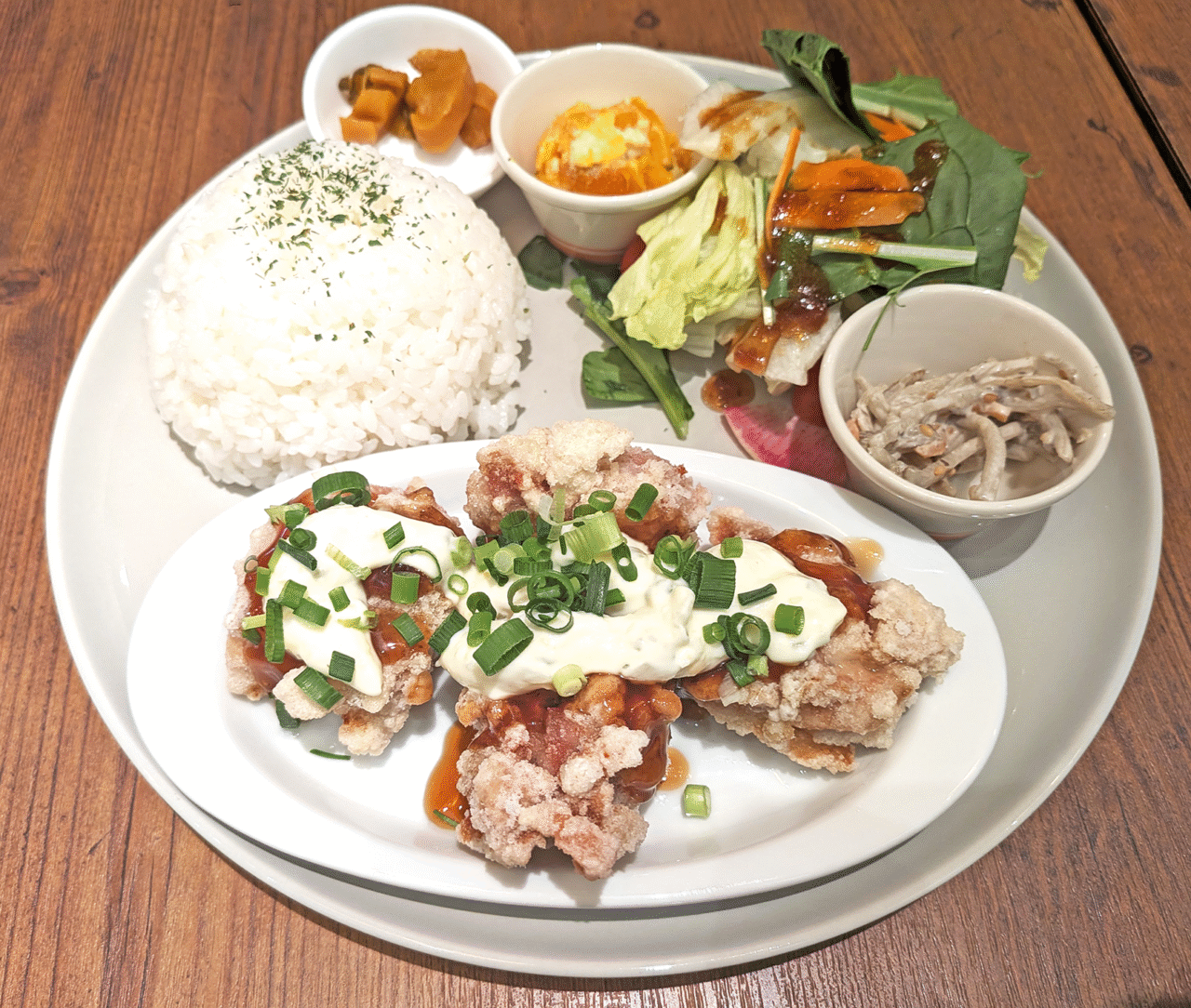 甘酸っぱいタレとたっぷりのタルタルソースがかかったチキンは、外はサクサク、中はジューシー。ご飯が進む味わいです。