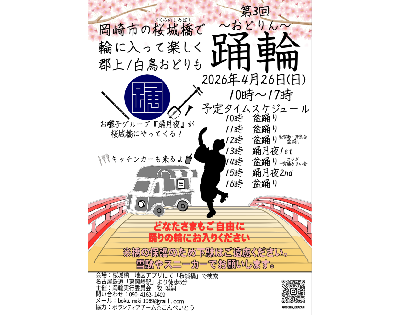 「踊輪(おどりん)」は、盆踊りを通して交流を図ることを目的としたイベントです。4月26日(日)、岡崎市の象徴である美しい桜城橋にて開催されます。