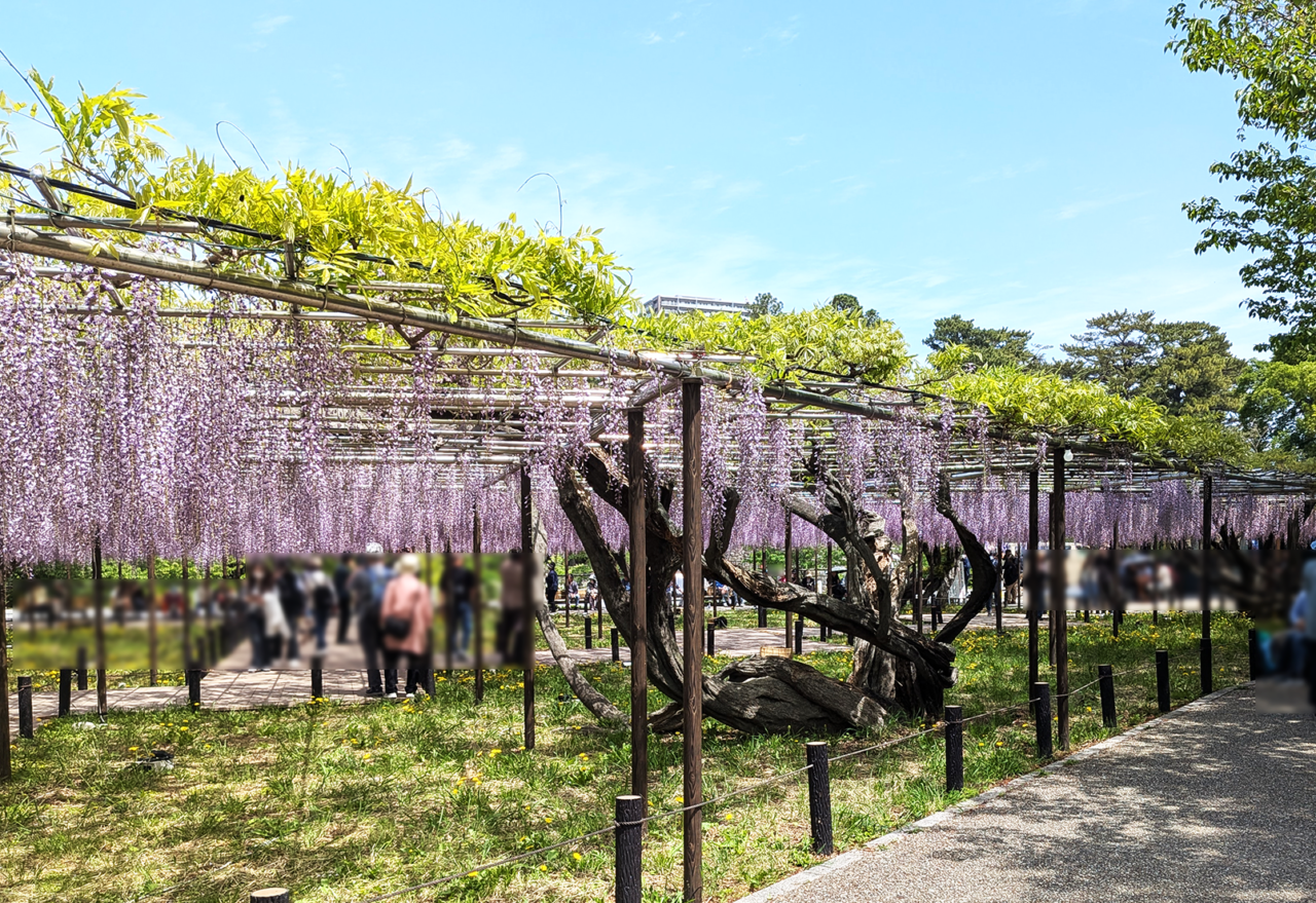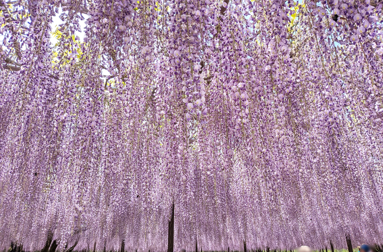 筆者が4月19日(日)に訪れた際には、すでに藤棚は圧巻の美しさでした。藤棚の中に一歩足を踏み入れると、紫色の洪水が視界いっぱいに広がり、思わず息を呑むほどの光景です。