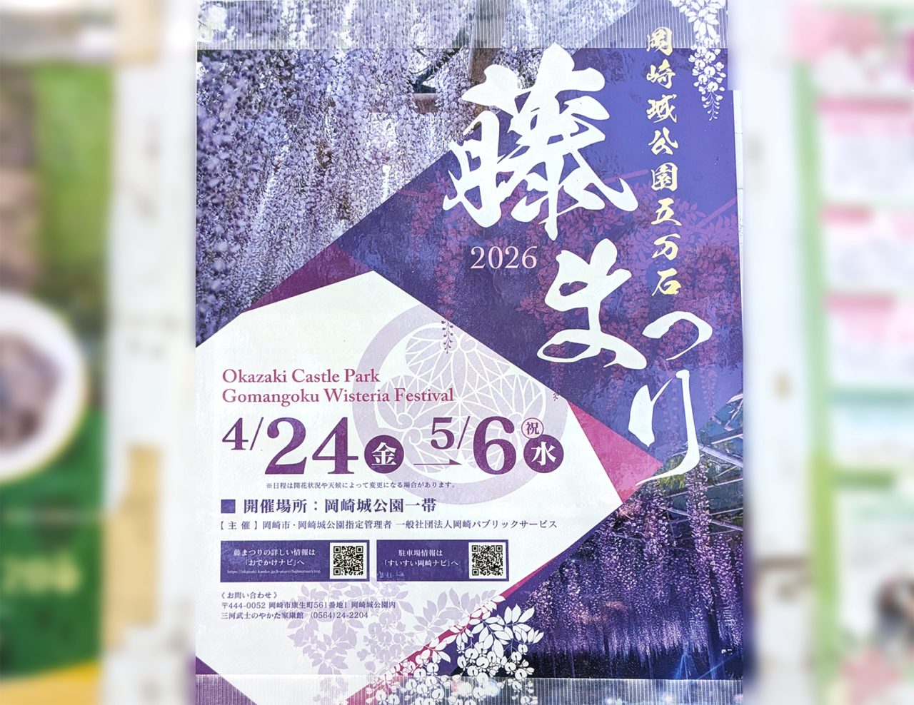 さて、この美しい藤をより一層盛り上げる「五万石 藤まつり」もまもなく開催されます。園内に掲示されていた最新のポスターによると、2026年の開催は以下の通り予定されています。